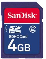 Paměťová karta typu Secure Digital značky SanDisk o kapacitě 4 GB s označením High Capacity (SDHC) Class 2. Karta je určená pro zařízení náročná na svoji kapacitu. Rozměry paměťové karty činí 24 x 32 x 2.1 mm a hmotnosti 2.3 gramů. Paměťové karty SD jsou určeny k použití v přenosných hudebních přehrávačích, zařízeních PDA, digitálních fotoaparátech, videokamerách, mobilních telefonech nebo počítačích.